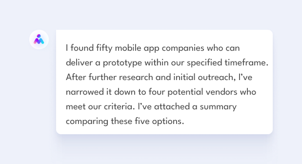 Your assistant will research potential vendors based on the criteria you specified, starting with approved vendors in your company’s database.