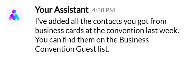 Your assistant can add new contacts, sort and label them, and update you as they do.