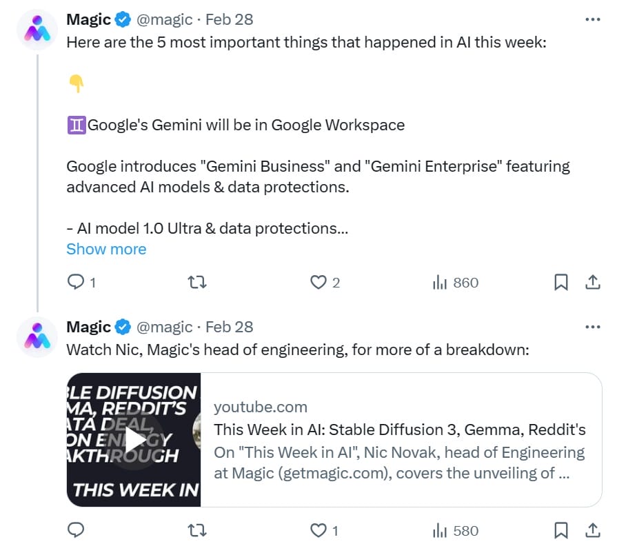 - Repurpose posts on other platforms: If you post on other platforms, like LinkedIn, Medium or a company blog, you can have your assistant post quotes, excerpts or teasers from those. While you can link to the source material, make sure not to do so in the first post, since that will detract from your reach on X.