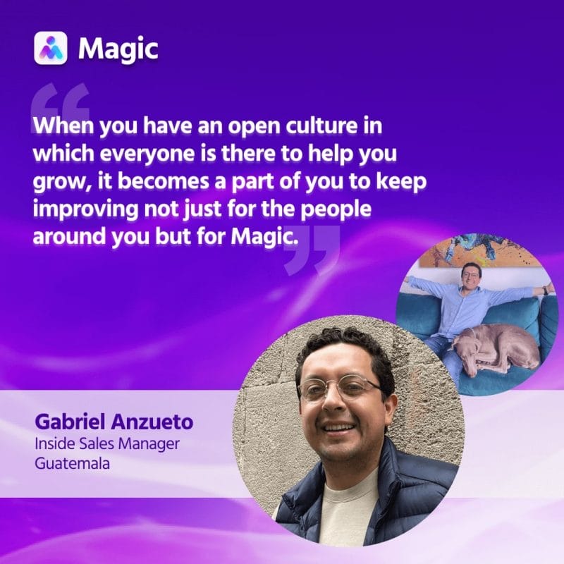 Meet Gabriel Anzueto, a trailblazer from Guatemala, who swiftly rose from Business Development to Leadership. Leading our Inbound team, Gabriel thrives by embracing the 4 pillars of Remote Empathy. At Magic, we’re driven not only by challenges, but by purpose. Connecting people to foster business growth is our mission, and it fuels our passion. With constant coaching and an open culture, Gabriel flourishes, helping his team succeed both professionally and personally. Join us in celebrating our diverse global family, where work, life, and even furry friends intertwine in perfect harmony.
