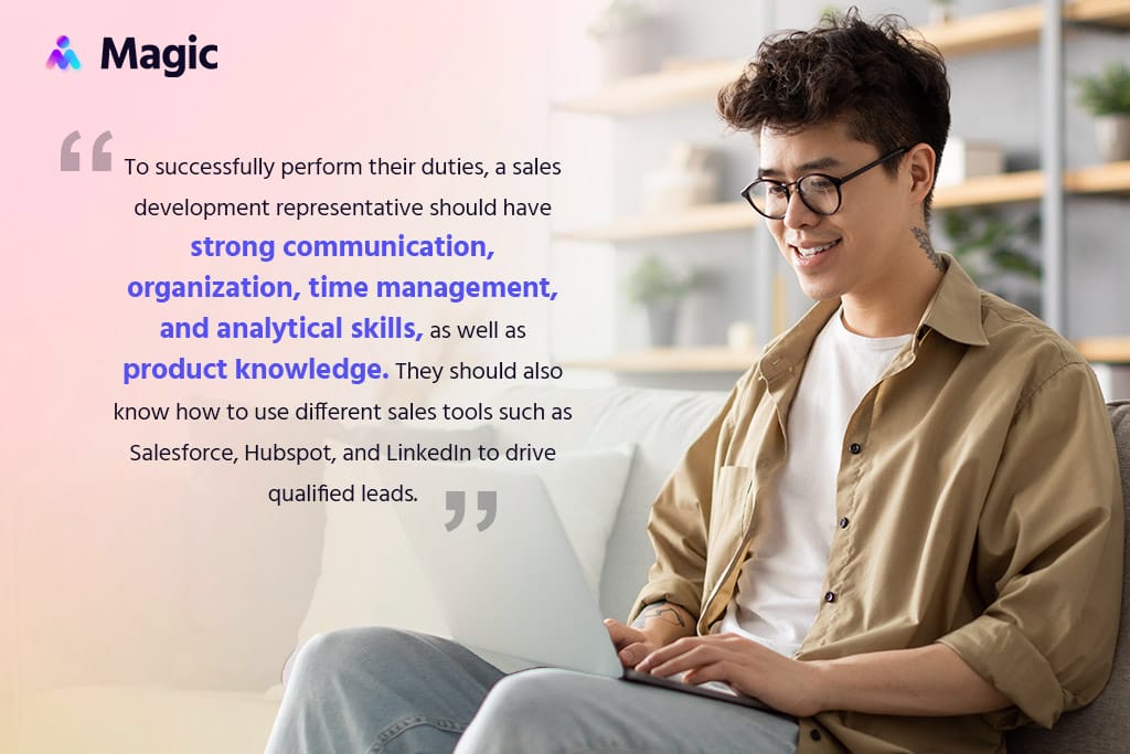 To successfully perform their duties, a sales development representative should have strong communication, organization, time management, and analytical skills, as well as product knowledge. They should also know how to use different sales tools such as Salesforce, Hubspot, and LinkedIn to drive qualified leads.
