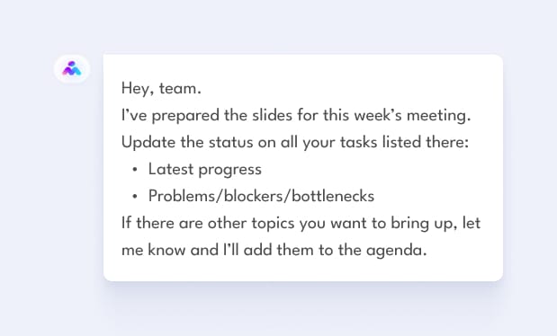 They’ll email the report to all stakeholders or prep it for your next meeting. Your assistant can also answer follow-up questions for you about the project over chat or email.