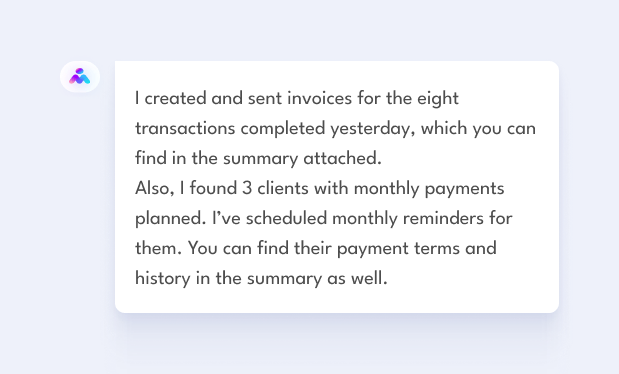 That said, your assistant can also draft and send emails with additional information. This includes notes on itemization and payment terms, or summaries of things you’ve discussed previously.