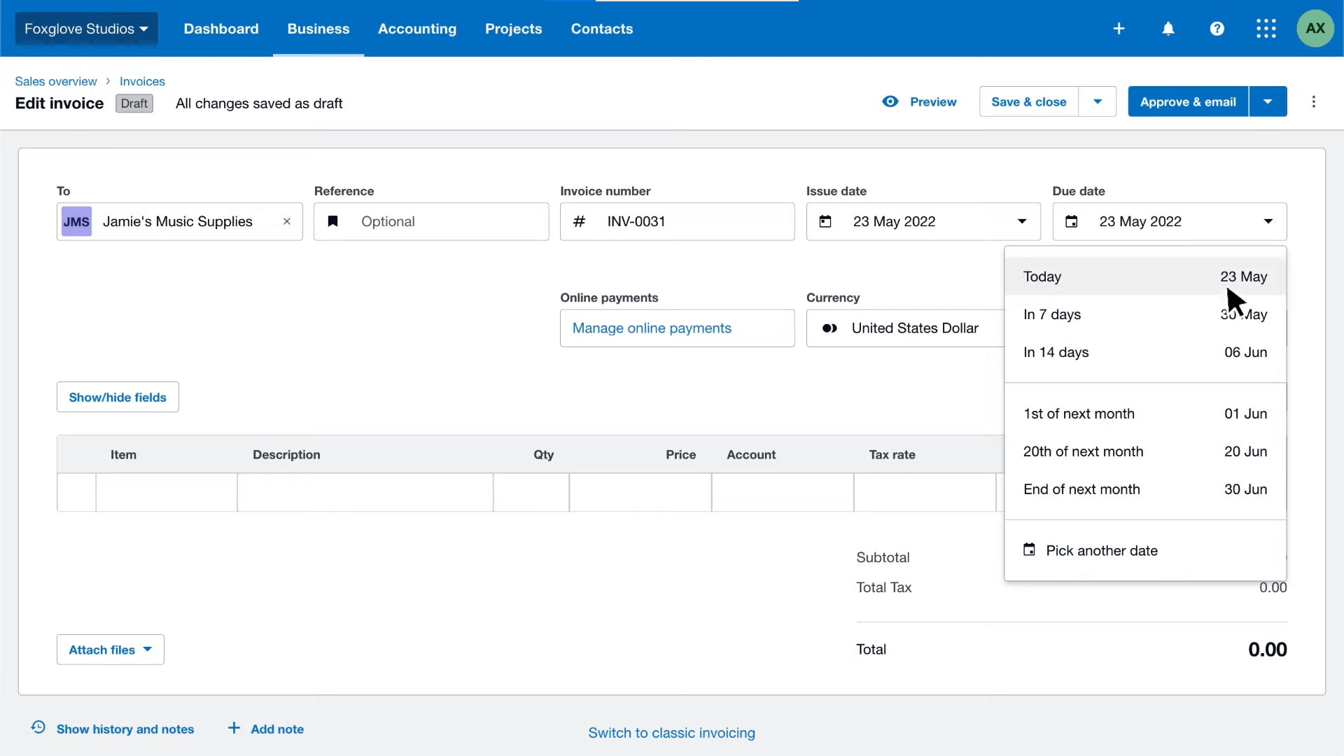 Platforms like Xero automatically enter invoice details, which you can then customize.