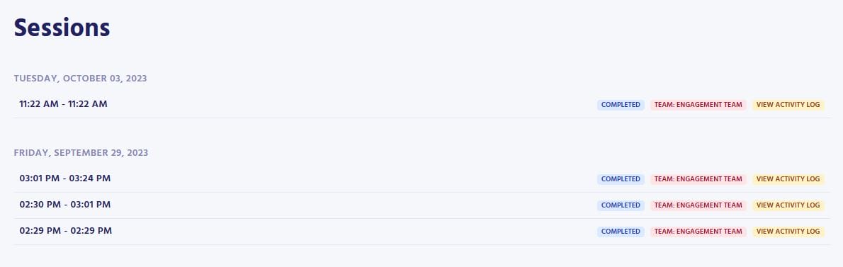 The sessions page displays your clock in/out sessions. This page ensures that every clock in and clock out is recorded and visibly documented for reference.